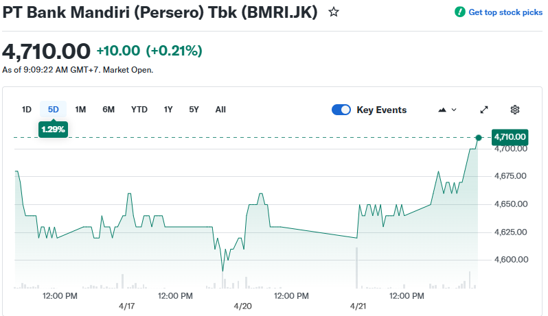 Kalau kamu lagi mantau saham perbankan, khususnya BMRI, pembukaan pasar hari ini, Rabu 22 April 2026, bisa dibilang cukup menarik buat dicermati. Di awal sesi perdagangan, saham PT Bank Mandiri (Persero) Tbk langsung bergerak naik tipis sekitar +0,65% ke area Rp4.650, setelah sebelumnya ditutup di Rp4.620. Pergerakannya juga cukup aktif di rentang Rp4.620 sampai Rp4.680, yang biasanya jadi sinyal kalau ada minat beli yang mulai masuk sejak pagi.