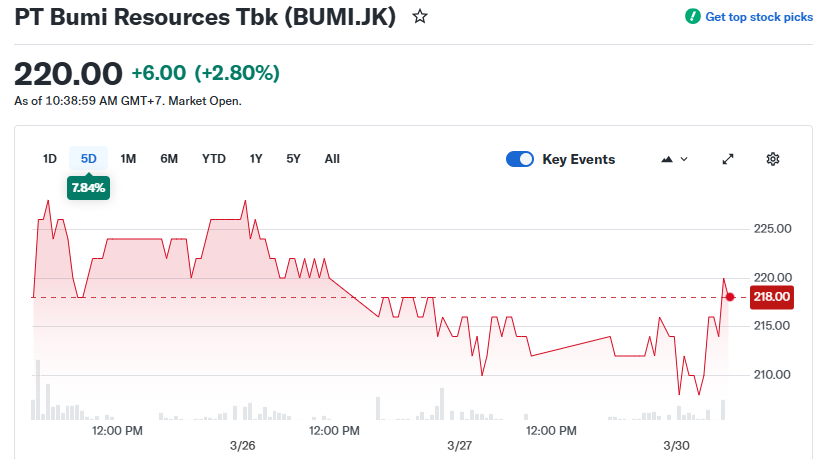 Kalau kamu lagi mantengin saham-saham tambang di Bursa Efek Indonesia, pergerakan saham PT Bumi Resources Tbk (BUMI) belakangan ini cukup menarik buat diperhatiin. Di sesi perdagangan Senin, 30 Maret 2026, saham BUMI memang sempat kasih napas lega ke investor setelah ditutup naik tipis sekitar 0,93% ke level Rp216 per saham. Kenaikan ini memang nggak besar, tapi cukup jadi sinyal bahwa masih ada minat beli di tengah tekanan yang belum sepenuhnya hilang dari sektor energi.