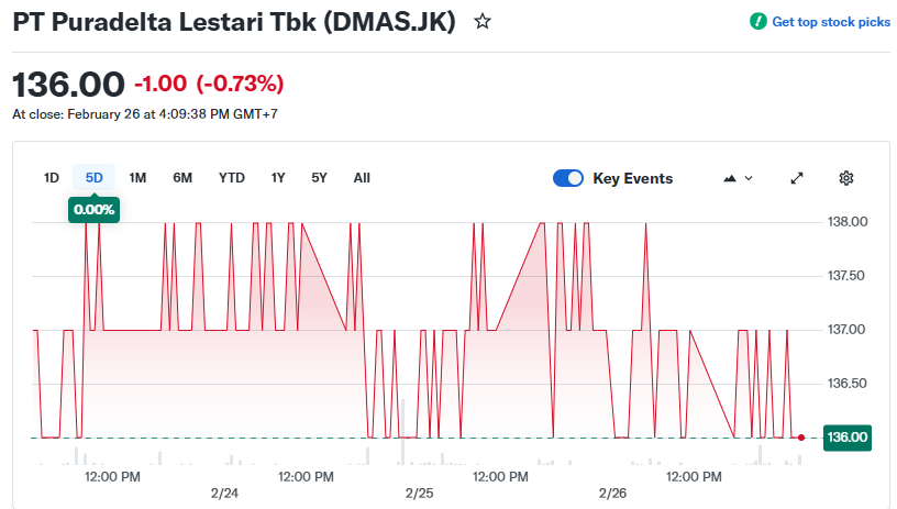 - DMAS menargetkan marketing sales Rp2,08 triliun untuk 2026, namun sahamnya tetap ditutup melemah 0,73% di Rp136 pada 26 Februari 2026.