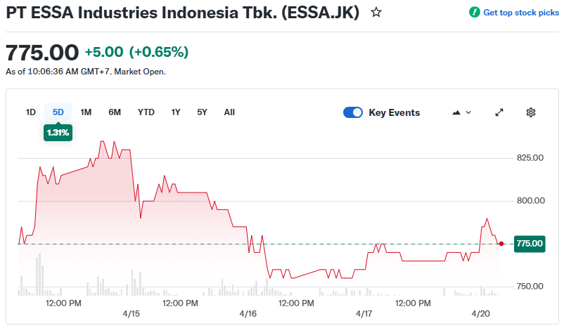 • Saham ESSA naik tipis +1,96% ke Rp785 di 20 April 2026, didorong sentimen positif dari harga amonia global.