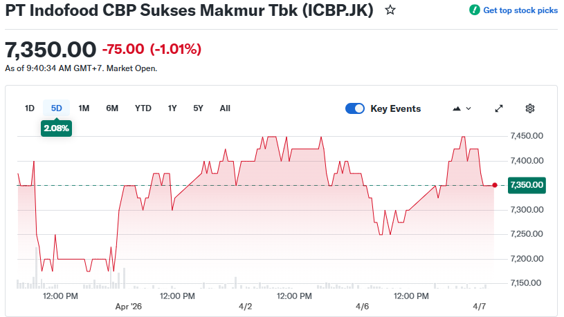 • Saham ICBP turun tipis ke kisaran Rp7.375–Rp7.425 pada sesi perdagangan 7 April 2026, terdorong sentimen hati-hati investor setelah rilis panduan kinerja 2026.
