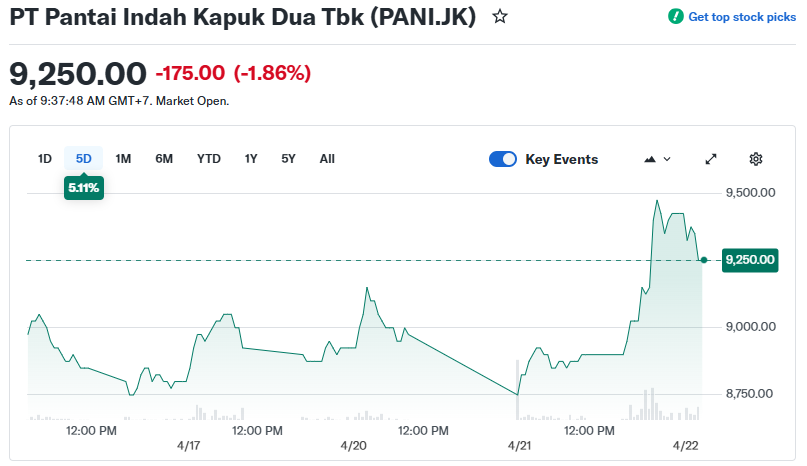 Kalau kamu ngikutin pergerakan saham properti belakangan ini, PANI lagi jadi salah satu yang cukup menarik buat diperhatiin. Di perdagangan Rabu, 22 April 2026, saham PT Pantai Indah Kapuk Dua Tbk ini kelihatan cukup “hidup”, bahkan saat kondisi pasar lagi nggak terlalu bersahabat.