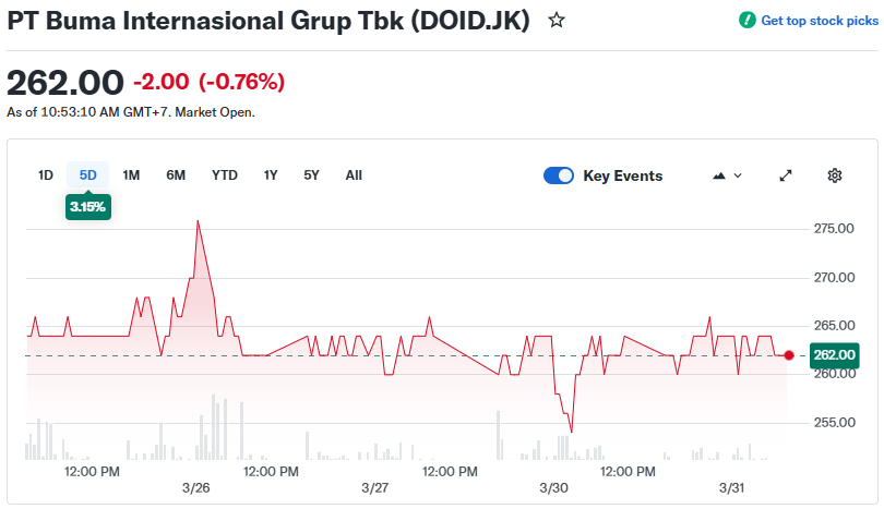 Kalau kamu ngikutin saham sektor tambang dan kontraktor tambang di Bursa Efek Indonesia, nama DOID alias PT BUMA Internasional Grup Tbk pasti bukan hal baru. Tapi belakangan ini, pergerakan sahamnya cukup bikin investor mikir dua kali. Di perdagangan Selasa, 31 Maret 2026, saham DOID terlihat masih belum lepas dari tekanan dan ditutup turun tipis sekitar 0,78% ke level Rp254. Penurunannya memang nggak dalam, tapi cukup menggambarkan bahwa pasar masih wait and see terhadap arah bisnis perusahaan ini ke depan.