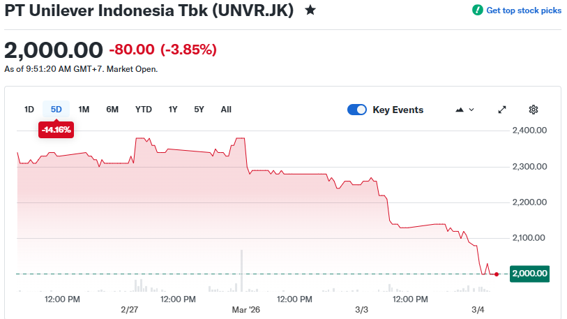 Di penutupan perdagangan Selasa, 3 Maret 2026, saham UNVR ditutup di level Rp2.080, anjlok 7,56% dibandingkan penutupan sebelumnya di Rp2.250. Penurunan ini tergolong signifikan untuk saham big cap defensif seperti Unilever. Tekanan jual terlihat cukup agresif sejak sesi siang, dan berlanjut hingga menjelang penutupan.